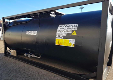 The Bitutainer Tank is a specialized tank unit for storing and transporting heated liquid bitumen and related high-viscosity products. Fitted with heating coils or electrical heating systems, this tank ensures product remains pumpable upon arrival.